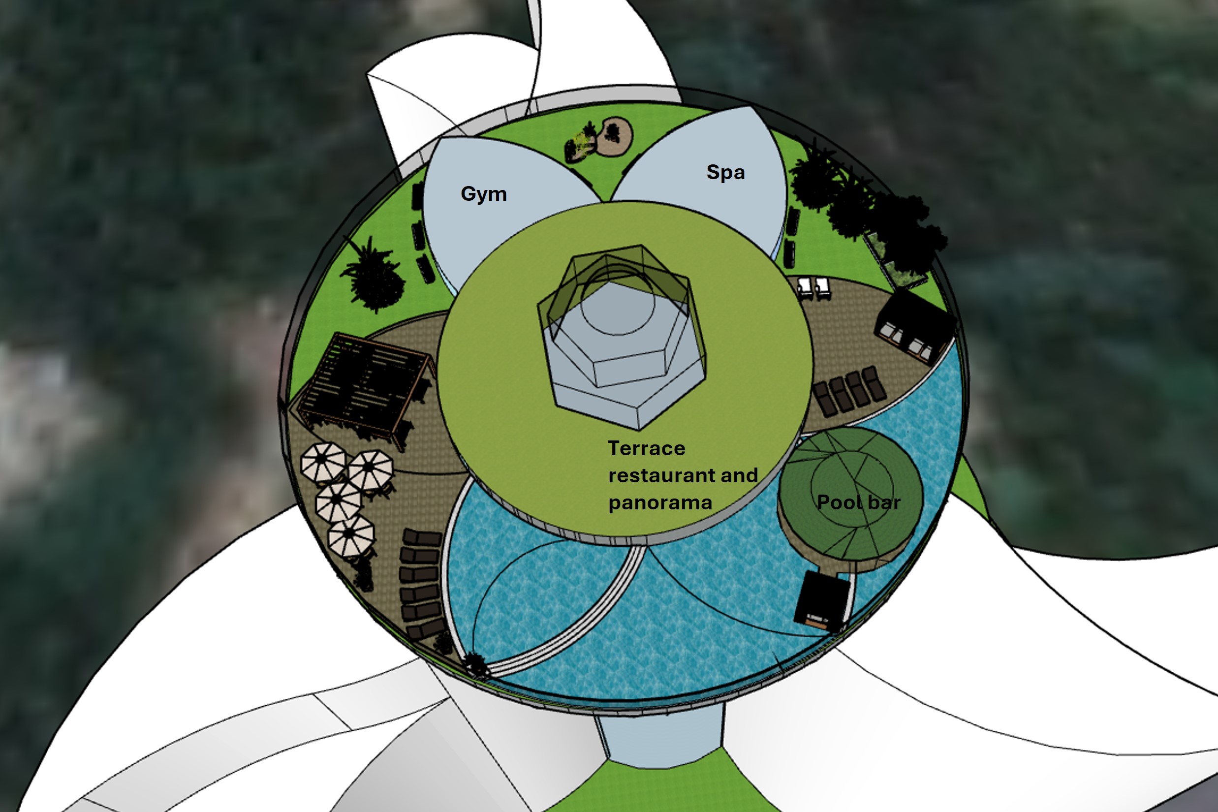 Above the bridges, giant glazed “umbrellas” act as adaptive shading tools. Inspired by sustainable technology used in Masdar City (UAE), these canopies move with the sun to provide shelter during the day, store thermal energy, and release warmth at night—enhancing comfort across the development.