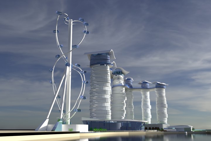 The development includes six striking residential towers, each with an average height of 45 storeys, set atop four-storey podiums comprising office and commercial space. The towers are arranged according to the organic, water-inspired lines of the masterplan—forming a unified yet asymmetrical composition that reflects the surrounding lakefront landscape.