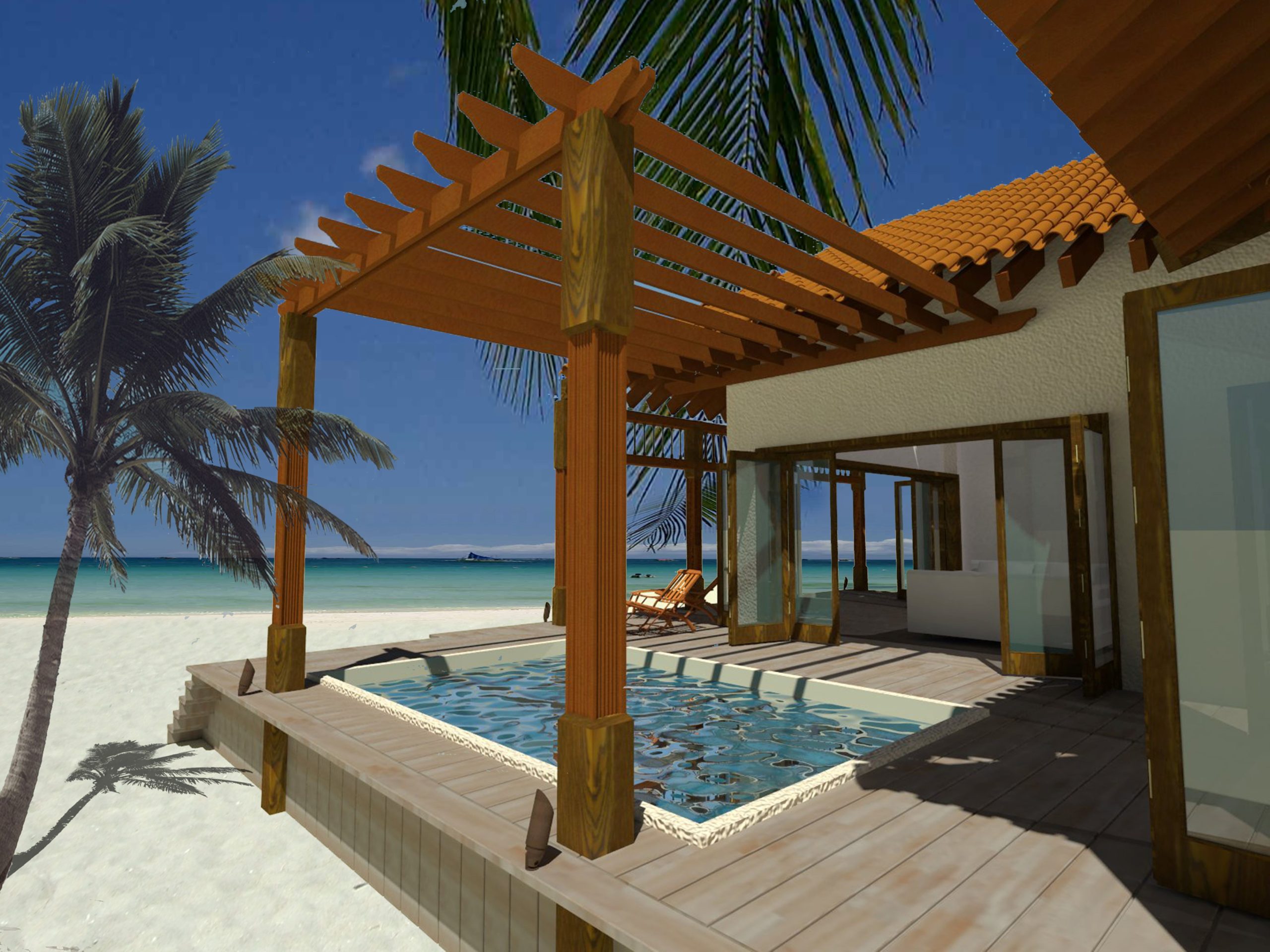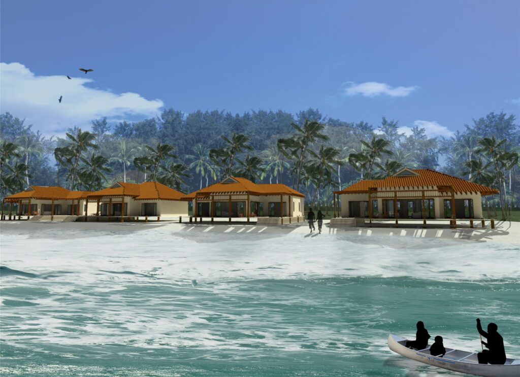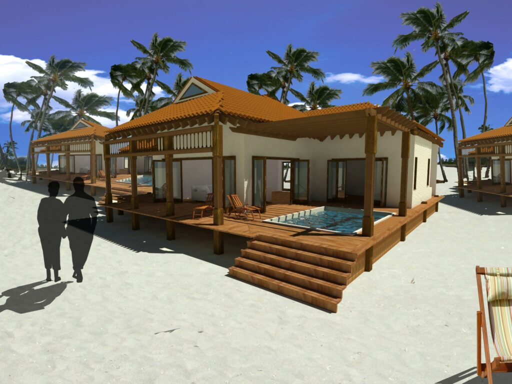 Project has marina with docking facilities and sea plane landing. This was a resort specially crafted to offer ultra luxury experience where guest travelling internationally would fly onto the island but there would be a small sea plane waiting to pick them up and fly then to otherside of the island to the resort and the immigration and the customs would be cleared at the resort. Tpycial room rates were forecasted at $10,000 per night.